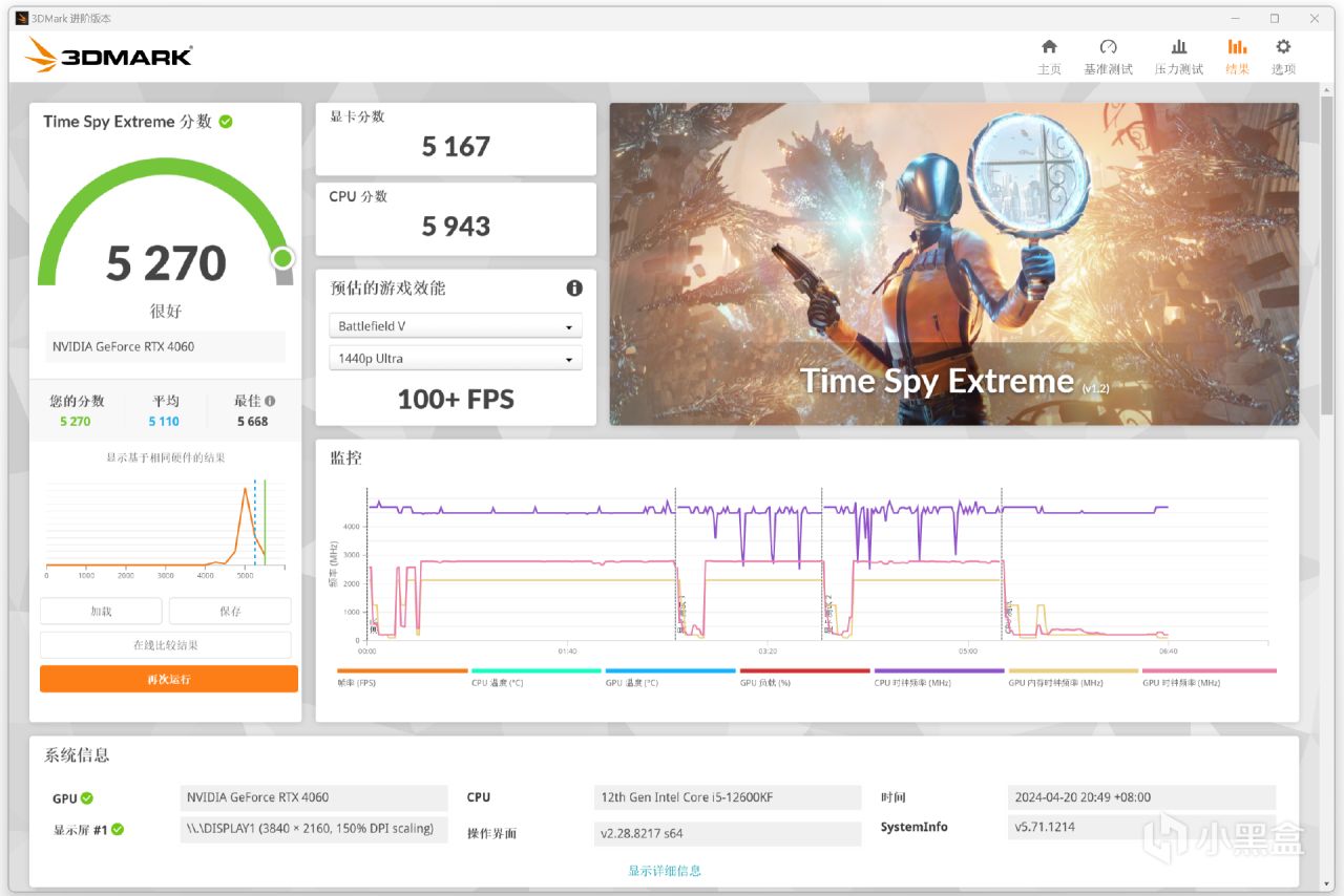 3DMARK Time Spy Exteme分數爲5270,顯卡分數爲5167,CPU分數爲5943。