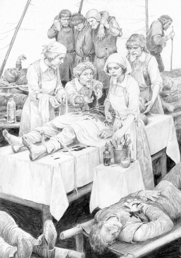 布倫納之戰中繁忙的戰地醫院,圖中矮人爲“鐵鏽”米洛•範德貝克,其餘女孩子爲夏妮,愛若拉二世,瑪蒂•索德格倫