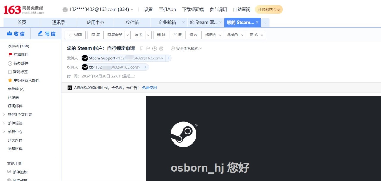 這裏爲大家說明一下,這是一個常見的功能,當你發現steam賬號被盜,但是暫時無法奪回控制權時,可以申請鎖定該賬號,而這需要郵箱權限。因此我第一時間意識到問題出在郵箱。
