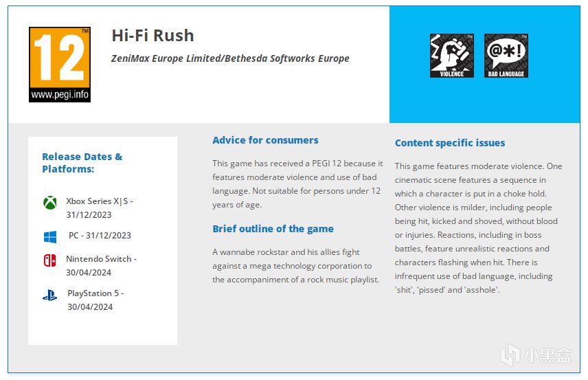 目前Switch版《完美音浪/Hi-Fi RUSH》已通过欧洲PEGI评级。