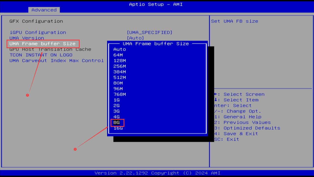最後,進入GFX Configuration後,選擇UMA Frame buffer Size,默認是4G,可以手動將獨顯專用顯存切換成8G,不建議切換成16G,提升不大=浪費內存。