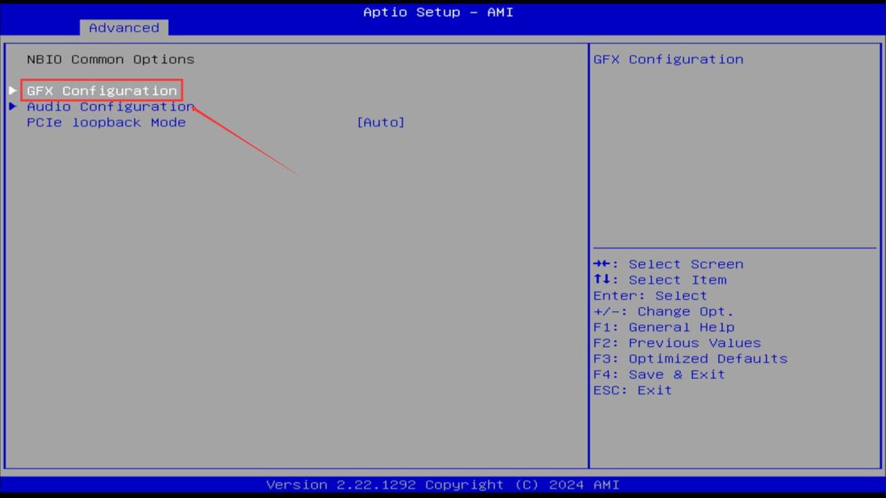 進入NBIO Common Options後,選擇GFX Configuration,回車進入下一級配置頁面。