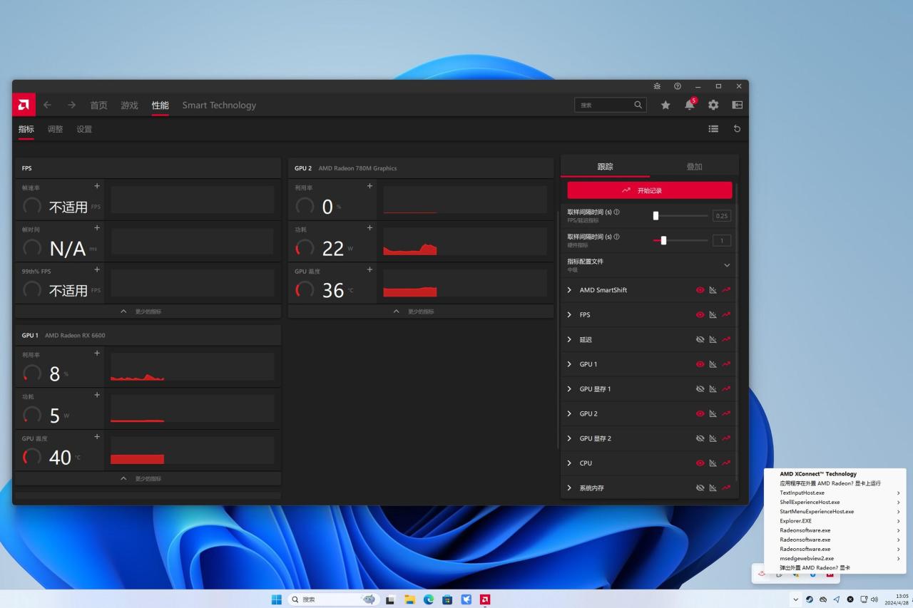 走USB4接口接入這張雷電3協議的RX6600顯卡拓展塢,Windows可以直接識別使用,並且可以用AMD XConnect這個官方工具管理+查看外置顯卡的工作狀態。
