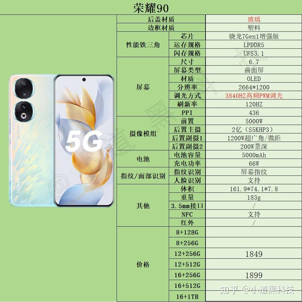 简评:荣耀90在看得见的地方配置都很顶,比如机身,屏幕,影像能力,但是看不见的地方表现一般:比如性能,主摄不支持光学防抖,不支持红外等等。