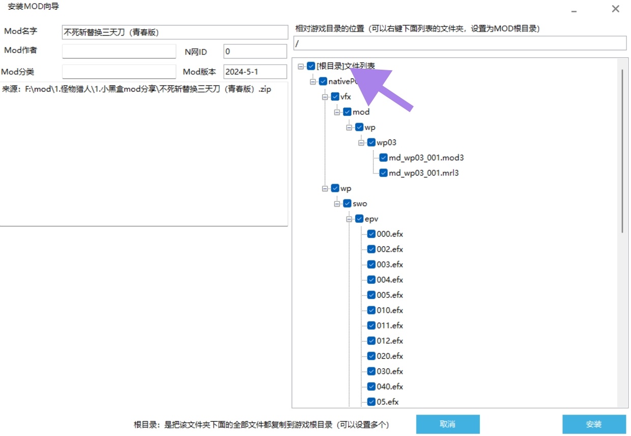 拖入mod之後,就會彈出以下畫面,記得檢查根目錄下面是否有虛線連着nativePC,如果有,那麼就可以點擊安裝