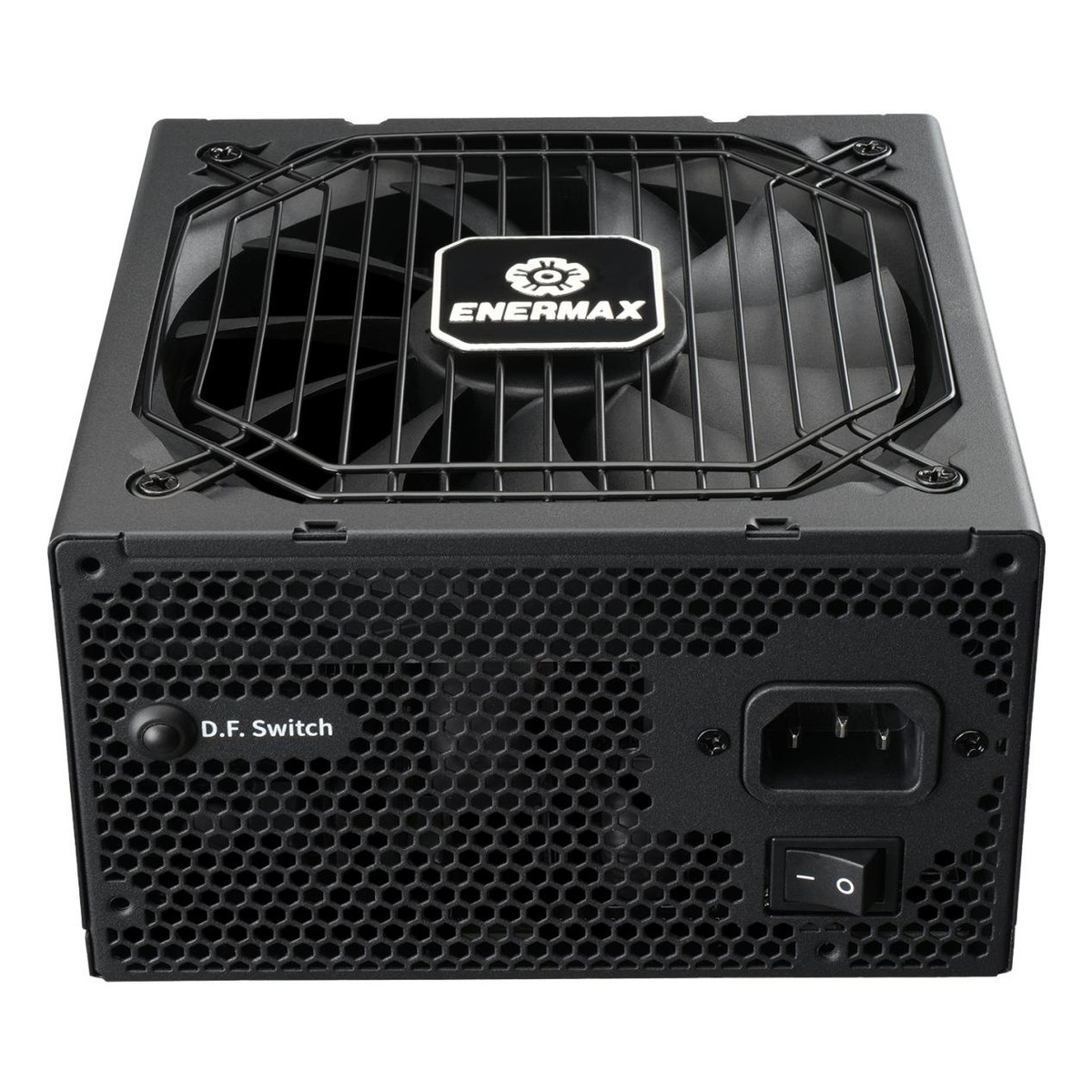 220V市電入口端特寫:顯眼的D.F.Switch按鈕可以進行物理除塵,即:風扇啓動前15秒高速逆轉,雖然轉回順轉,可以有效彈走風扇扇葉灰塵,減少電源故障概率。