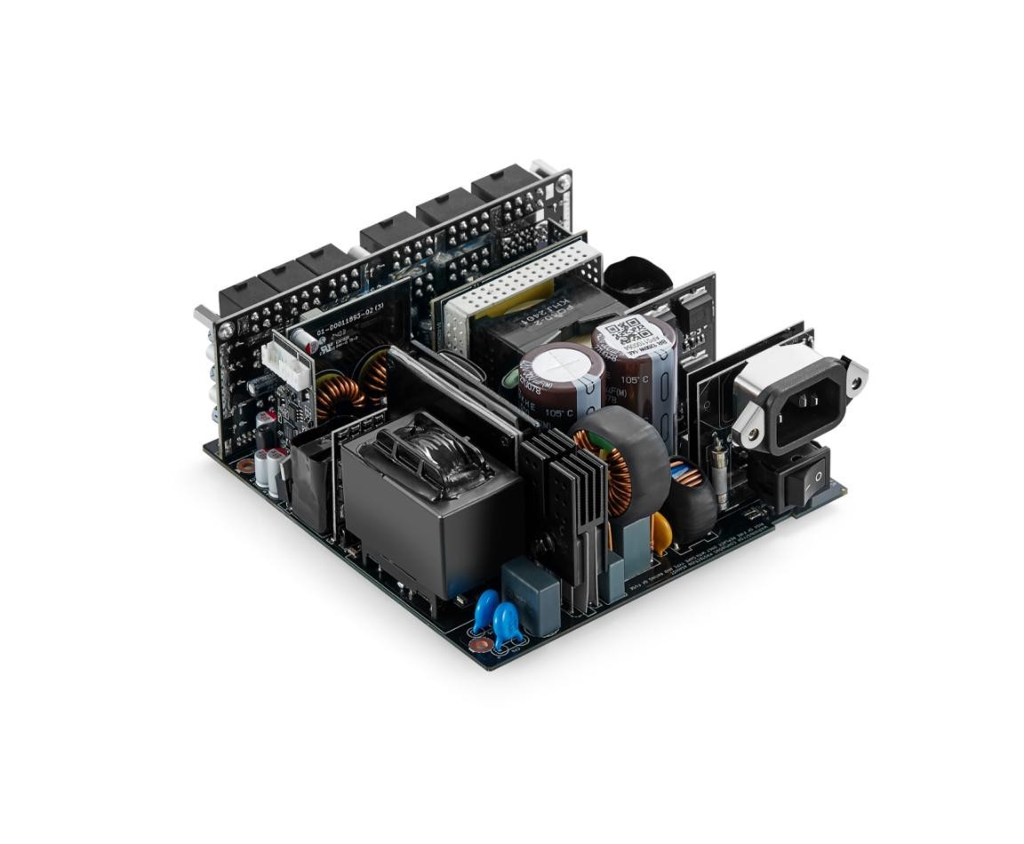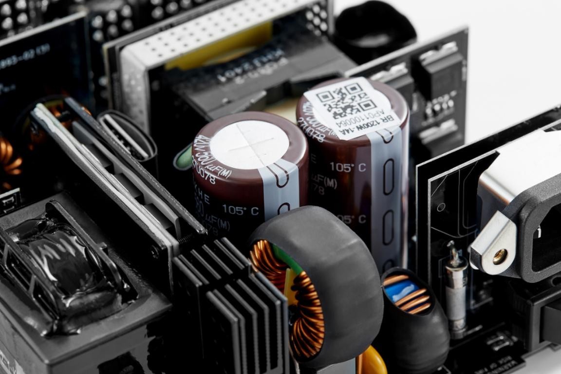在電源拆解圖上我們可以看到,該電源的用料堪稱奢華,不僅是雙主電容,而且每個都是420V/560uF的日系黑金剛高耐壓高耐溫固態系列,可承受多達235%的瞬時峯值功耗,這對於主機尤其是顯卡和固態的保護尤爲重要!
