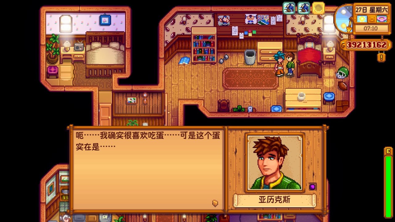 衆所周知,亞歷克斯是咱們星露谷中的健身達人,體育生代表,通過彩蛋節與他的對話,我們會知道他十分喜歡喫蛋,每天都需要攝入很多的蛋白質來增加他的肌肉,那我們來看看把鸚鵡蛋送給亞歷克斯,他會說些什麼吧!
