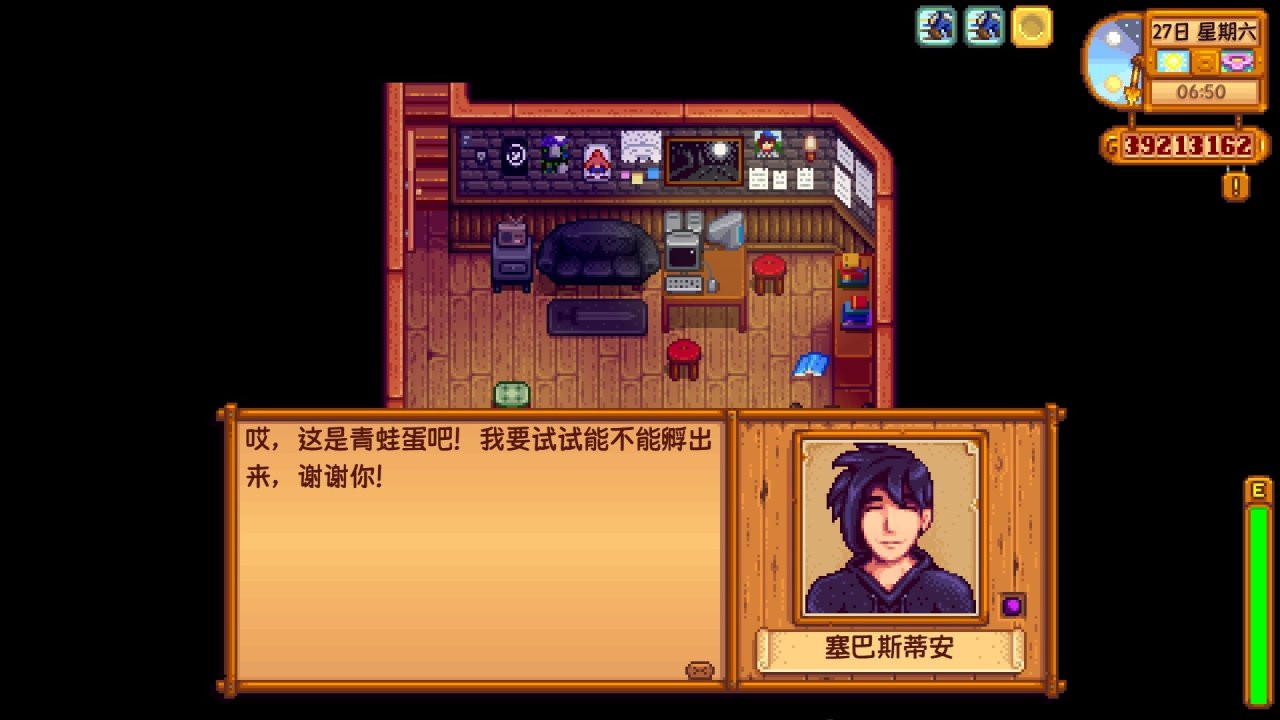 我們可以看到塞巴斯蒂安十分喜愛,想試試能不能孵出來,其實很多玩家應該不理解,爲什麼塞巴斯蒂安會喜歡青蛙蛋,我開始也不知道,但我去了解了他的14❤️劇情後,就恍然大悟了