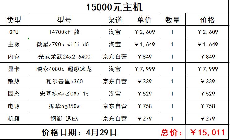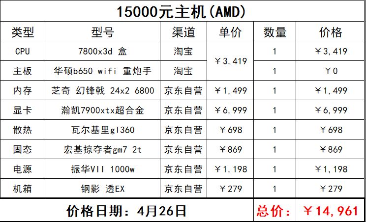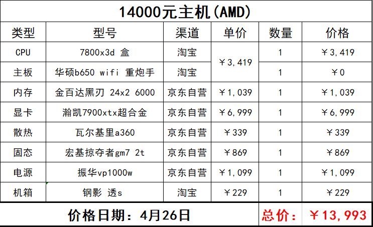 這一套基本上可以說是非常豪華了,也是我的作品裏面第一次出現芝奇的東西,而且除了班優以外基本上全部都是京東自營,不過之後的16000元檔應該就沒amd了,主要是我個人感覺也差不多到頭了,再往下寫好像也沒啥意義,也不是不能升級下一個檔換一塊x670的板正好再加1000(「・ω・)「