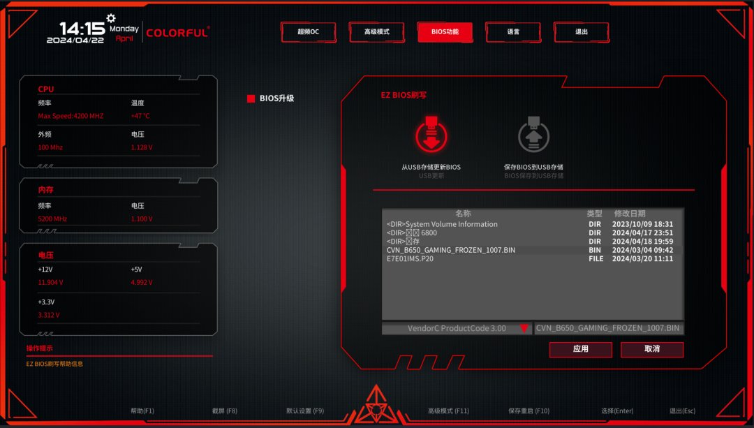 先將升級BIOS下載到U盤裏面,再點擊BIOS功能,點擊下載好的BIOS應用就行。