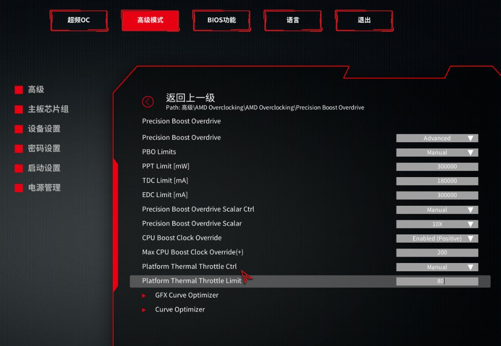 BIOS界面選擇高級模式,選擇第一個高級設置,點擊AMD超頻,進入CPU的PBO設置