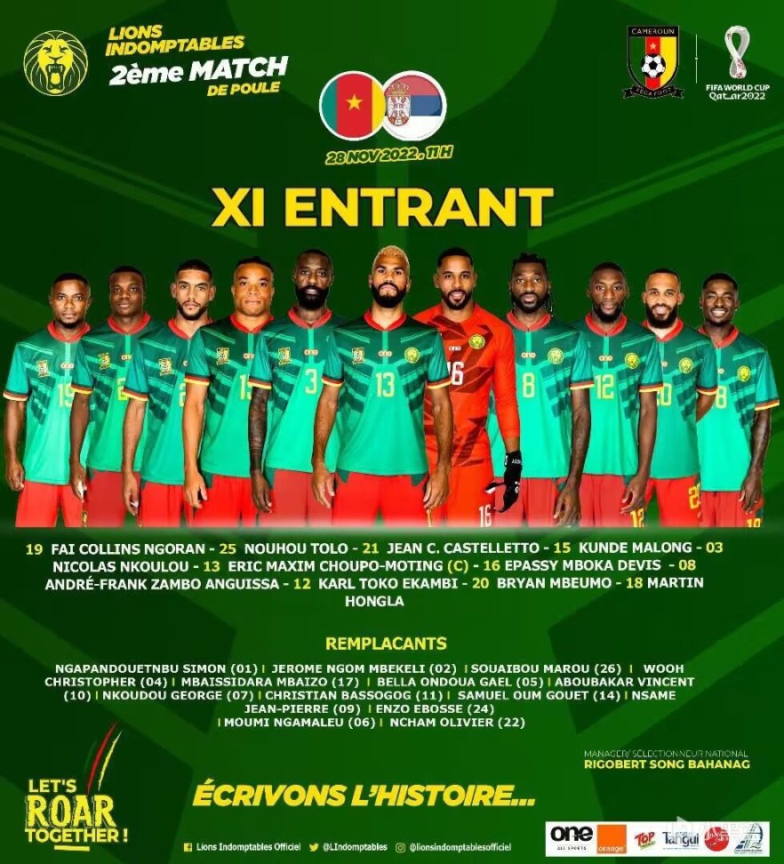 喀麦隆首发:16-埃普西、19-法埃、25-图洛、21-卡斯特略托、15-昆德、3-恩库鲁、18-洪拉、8-安古伊萨、13-舒波-莫廷、12-埃卡姆比、20-姆贝莫
