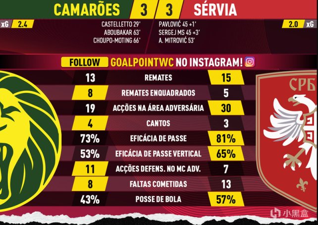 世界杯焦点战,塞尔维亚大战喀麦隆!上半场,米特洛维奇开场连续在禁区内形成打门机会,主裁判设备有问题,中国裁判马宁协助处理!喀麦隆角球战术取得领先,补时阶段,塞尔维亚3分钟内连进两球!下半场,非洲雄狮也三分钟连入两球,喀麦隆 3-3 塞尔维亚,顽强扳平比分!最终,比赛一波三折,塞尔维亚 3-3 打平喀麦隆!