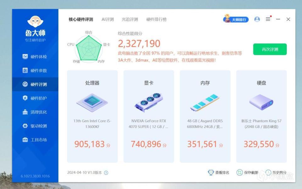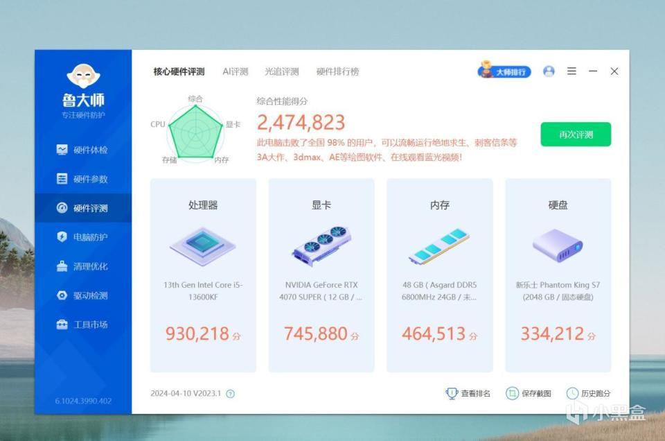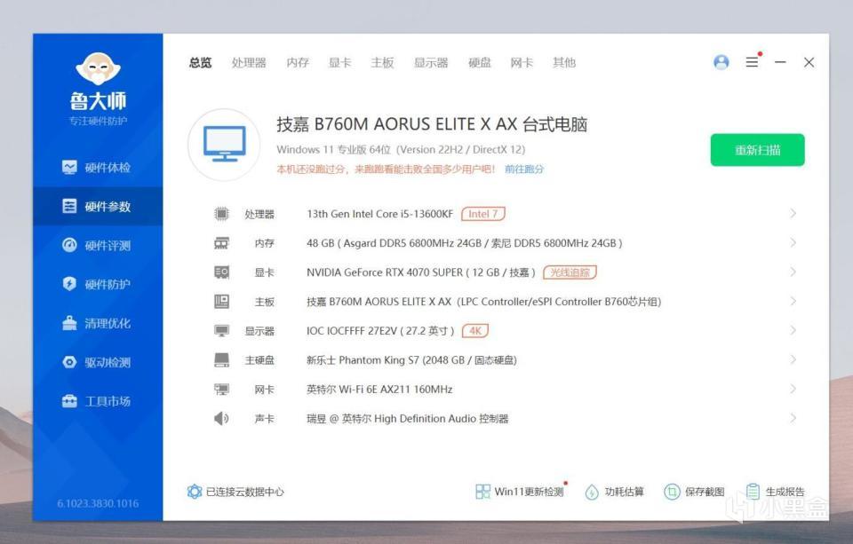 运行鲁大师,看看电脑配置,CPU是英特尔i5-13600KF,内存是阿斯加特,显卡是技嘉RTX 4070 SUPER 12GB,主板是技嘉B760M AORUS ELITE X AX,显示器是元创师4K显示器。
