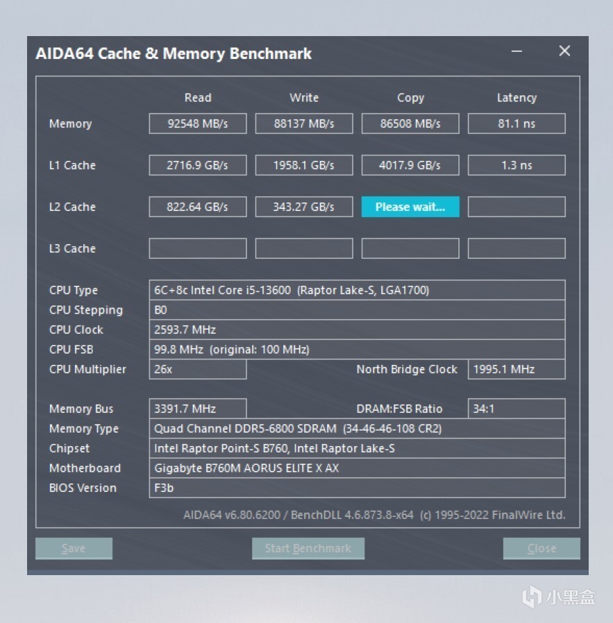 AIDA64内存测试,读取92548MB/s,写入88137MB/s,复制86508MB/s,延迟81.8ns。