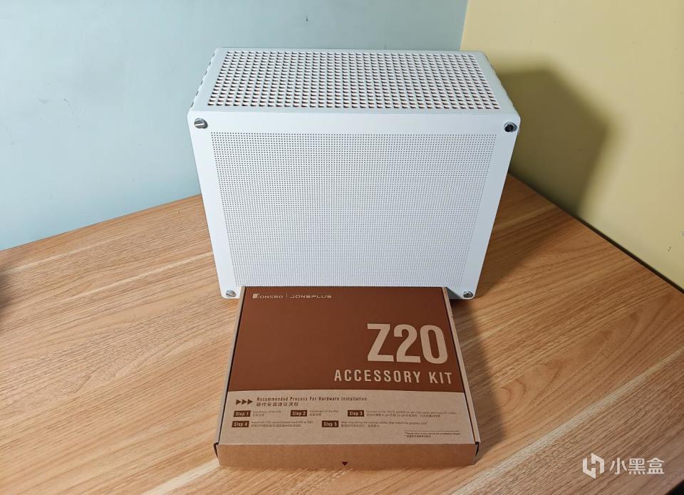 要想电脑小,机箱很重要。选用的机箱是乔思伯最新的Z20小机箱,虽然体积不大,但是可以支持M-ATX主板,不在局限于ITX主板,这样让消费者的选择多了很多。而且它还支持240水冷,这样使用高性能电脑的散热有了保证。我们看上图是机箱的右侧面,布满了散热孔,同时顶部也是同样全布满的散热孔。一个配件盒,和小机箱对比起来显得很大。
