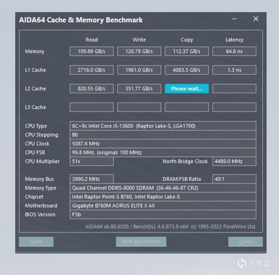 运行AIDA64内存测试,读写速度大幅提升,读取109.89GB/s,写入120.79GB/s,复制112.37GB/s,延迟缩小到64.8ns。