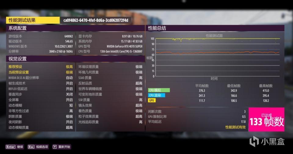 换一个游戏地平线5,最高的极高画质,同样开启DLSS和帧生成,显示达成133帧。