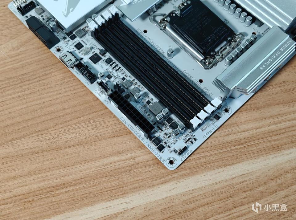 这款主板有4根DDR5内存插槽,经过加强设计,支持高达8266MHz以上的内存超频能力,支持性很好,两端的白色看上去很是醒目。主板上面接口丰富,常规的接口都齐全,从CPU风扇、水泵、ARGB彩光到SATA硬盘、前置面板的USB-A、USB-C,乃至于板载HDMI接口都有。