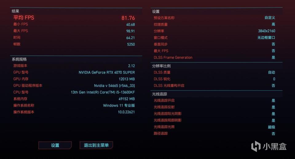 设置为4K分辨率,光线追踪设置为超级,开启DLSS,开启DLSS 帧生成,最终PFS是81.76。