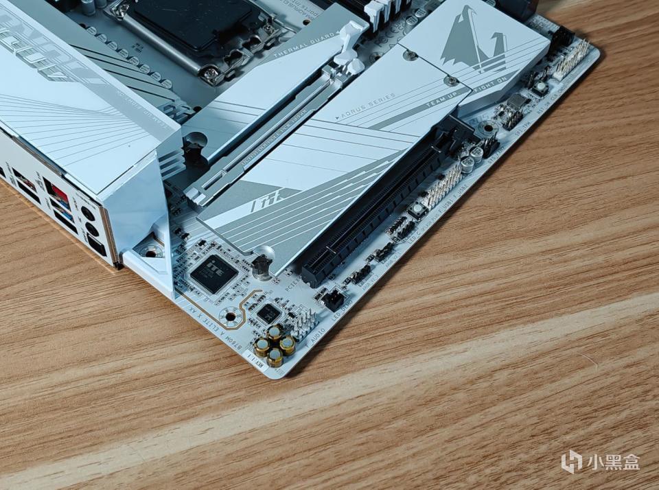 技嘉的这款B760M 冰雕X,是款全白色的主板,除了内存槽、各个接口、芯片外,眼睛所到之处都是白色的,同白色主题非常搭配。而且,它这个白色,不是惨白的一片,而是富有变化。比如主板的的确是偏灰色一些,而一体式IO散热片,散热马甲等,则是更加亮丽,带有图案,这样整体不单调。