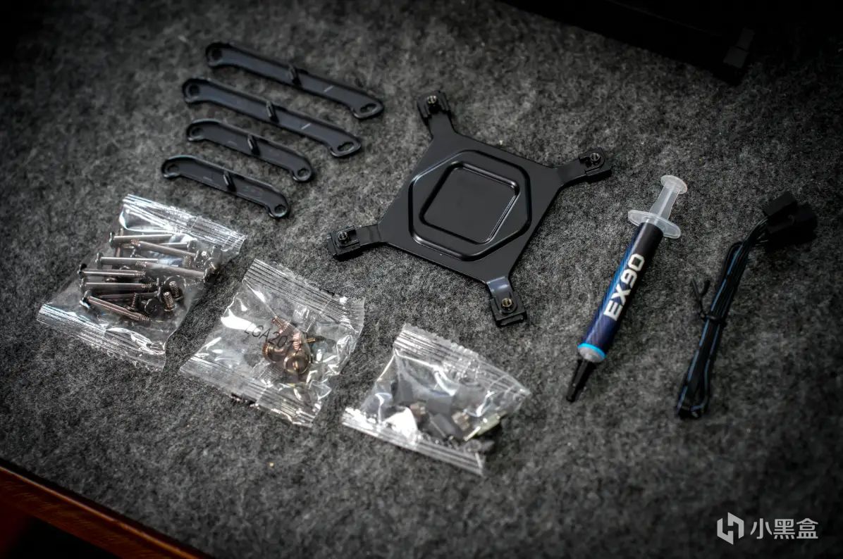 開箱很簡單,分爲一體式冷排、風扇、扣具套裝、上手指南等。