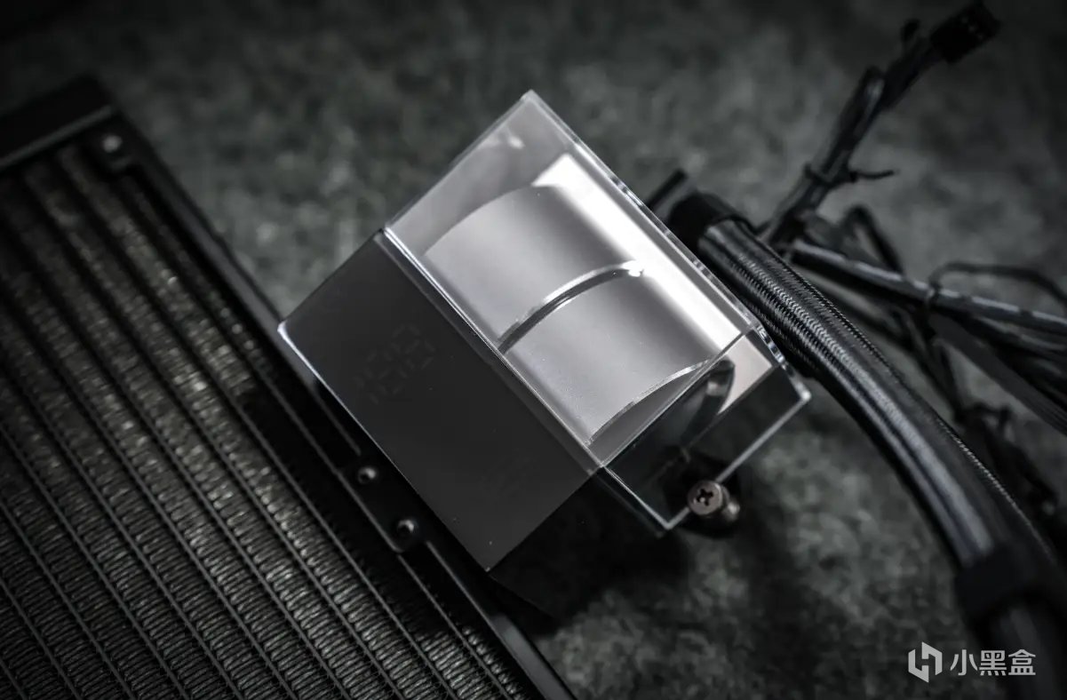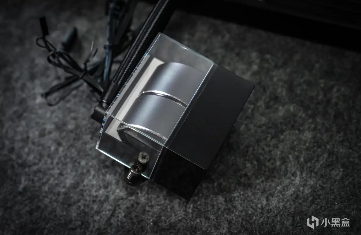 水冷頭的設計按官方的話爲方圓相融的極簡設計,其實就是採用了亞克力面板結合CNC鋁製水泵外殼,再加入ARGB無限鏡幻彩燈效,可以帶來一種非常炫酷的視覺效果。