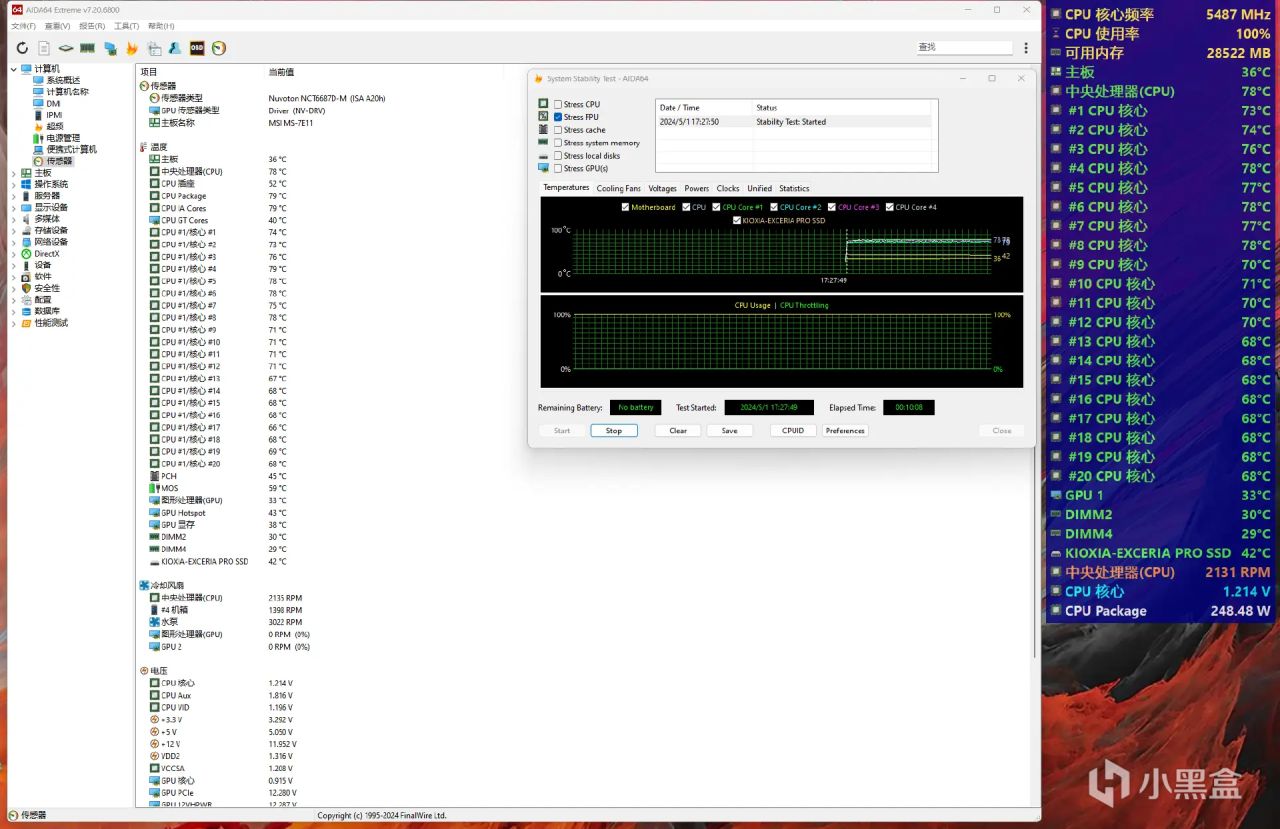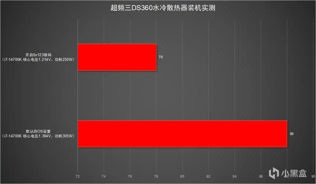 開啓0x123微碼後,i7-14700K的核心電壓下降到1.214V,CPU功率下降到250W左右,這時候通過超頻三DS360水冷散熱器的單烤FPU,核心溫度最低僅爲78℃,完全可以用非常涼快來形容。
