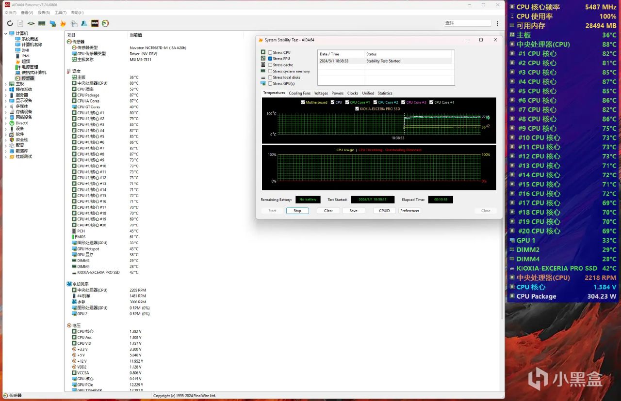 默認BIOS設置,通過AIDA64單烤FPU,i7-14700K的核心電壓達到了1.384V,功率爲305W左右,不過在超頻三DS360的壓制下,CPU的核心溫度僅爲88℃。