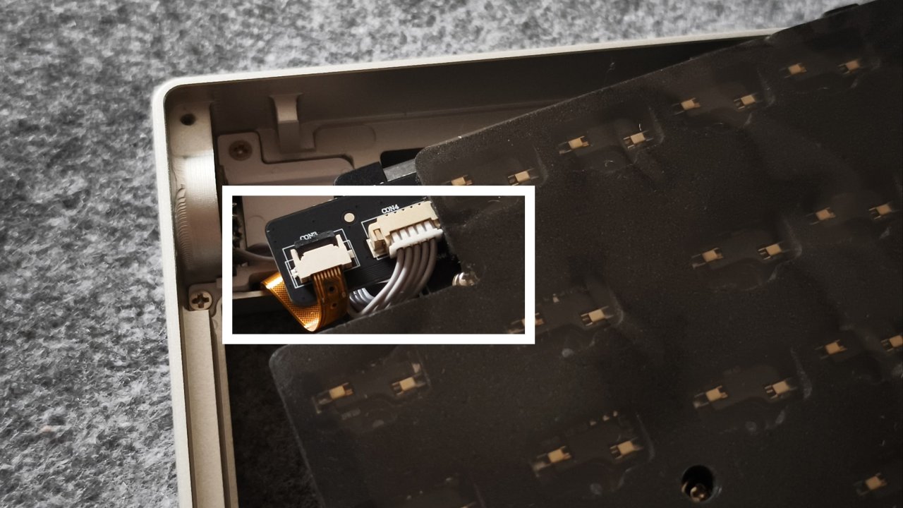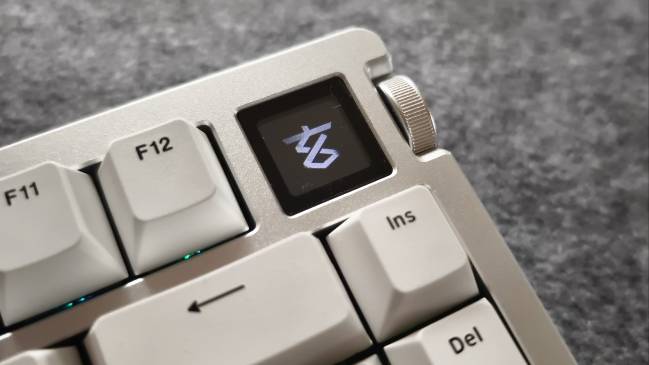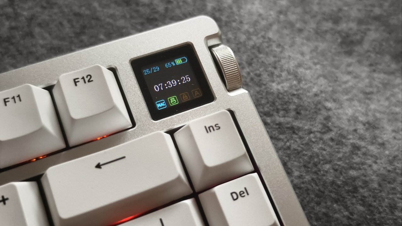 鍵盤的右上角你可以看到是有一個屏幕和旋鈕的。屏幕的大小爲0.85寸,確實挺小的一屏幕,但是麻雀雖小五臟俱全,該有的功能他都有,像是什麼顯示時間/電量/連接方式,這些基礎的功能肯定是有的。你也可以根據自己的喜好對它做一個自定義屏幕,讓我坤哥重返江湖。旁邊這個旋鈕啊其實並沒有什麼特殊的功能,就是調節音量大小而已,如果你日常做一些剪輯的工作,或者經常用來看電影,那這個功能挺不錯的。其實他最好的一點就是他這個旋鈕是做了內側的處理的,所以鍵盤的外觀不管是正面還是側面你看起來都不會那麼突兀,並且因爲旋鈕是金屬材質,轉動的過程中也會比較舒適嘛,比較光滑。