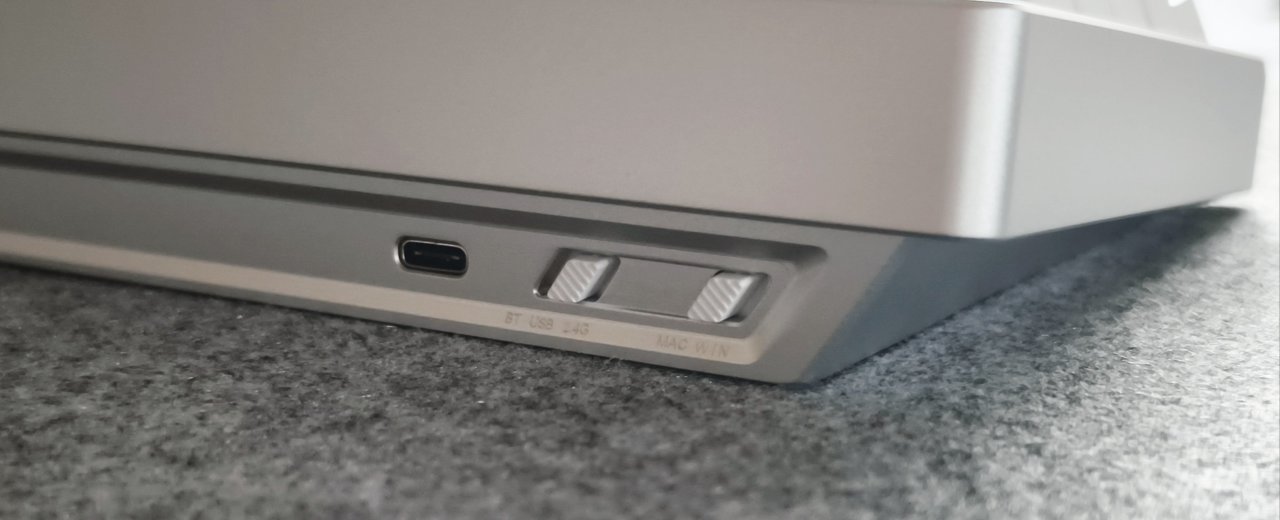 鍵盤的頂部你可以看到有一個type—c口與兩個切換按鈕,分別是三模切換以及WIN/MAC系統切換。在外觀的造型上面這兩個旋鈕也是比較符合他整體的一個外觀角度的吧,棱形的,看起來比較有那種科幻感