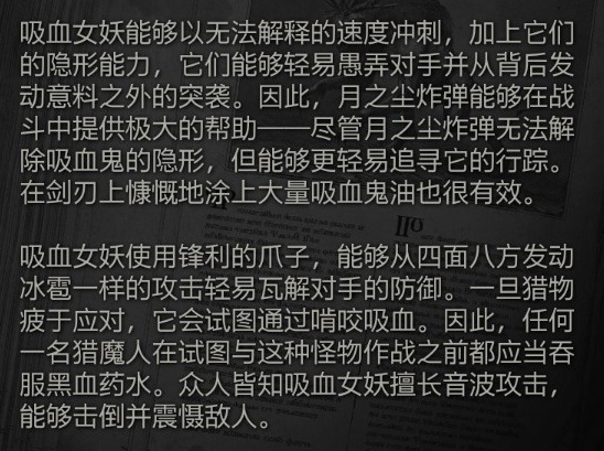 “想必各位和我以及傑洛特一樣,得知高等吸血鬼社會嚴格按照年齡劃分等級時一定非常好奇:吸血鬼越年長,他們的話語就越有分量,違揹他們的意願遭到的懲罰就越嚴重。”人物日誌