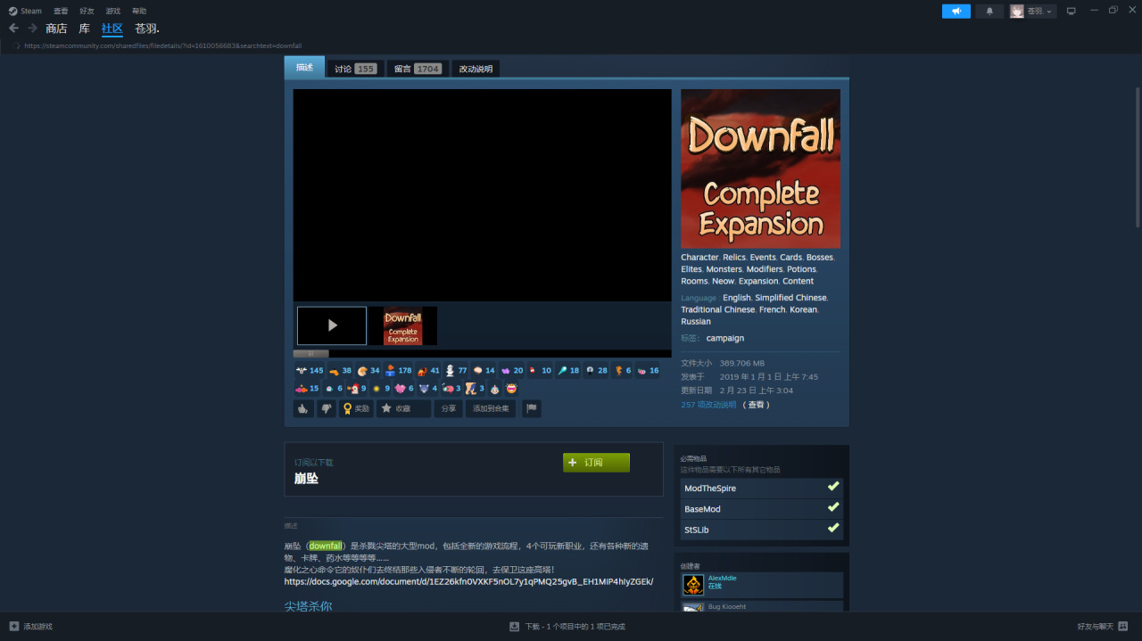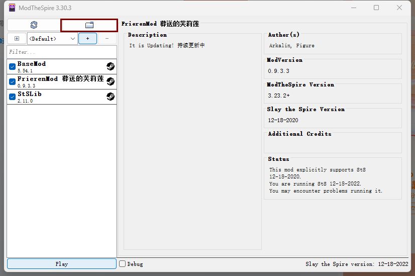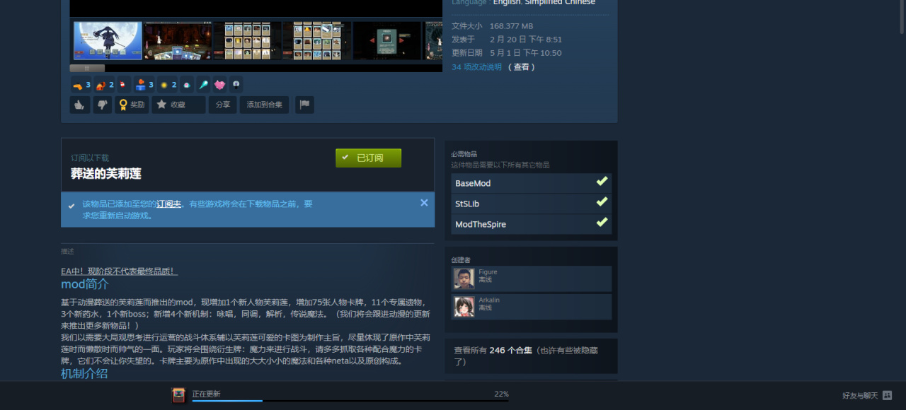 以芙莉莲mod为例,看到右边前置mod已经装上了(下面还在下载是因为这是我第一次打尖塔MOD,详见开头引号)