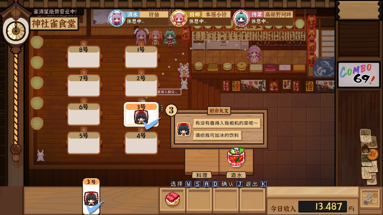 雀食的人物塑造可以说是做得非常好,人物的性格不仅体现在剧情、对话、好感度提升任务中,还体现在来吃饭时的要求中。比如灵梦在剧情、设定和捐钱箱上的表现就是主打一个穷,于是她来点菜时给的条件一般都是”贵的我可吃不起呀”与”有没有不用花大价钱的高级料理”。而像这种不同稀客的对话与点菜就潜移默化的让你知道人物的性格特点,后期某个稀客出现你就会下意识的知道做什么菜,这也代表了你脑子里已经对这个角色建立起初步印象。
