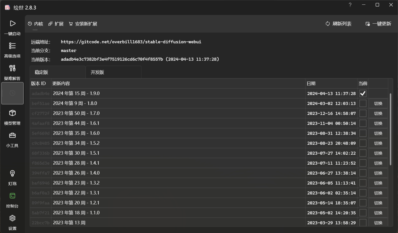注意的是,如果有安裝老版本的Stable Diffusion,可以選擇版本管理,可以一鍵更新到最新版本。