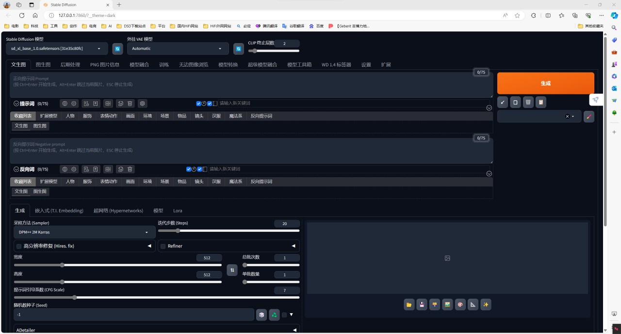 點擊一鍵啓動,會自動在瀏覽器當中打開一個網頁版的UI頁面。這個頁面就是我們的操作檯了,接下來就可以在裏面愉快地進行AI繪畫了。