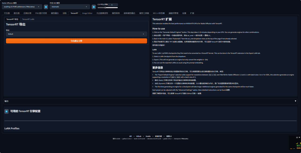 4、再次打開頁面後就可以看到WebUI裏會多了一個TensorRT 的頁面。