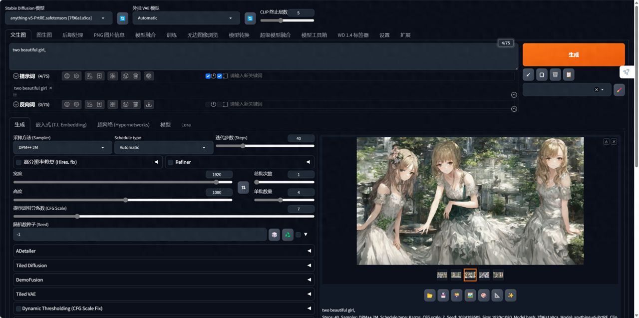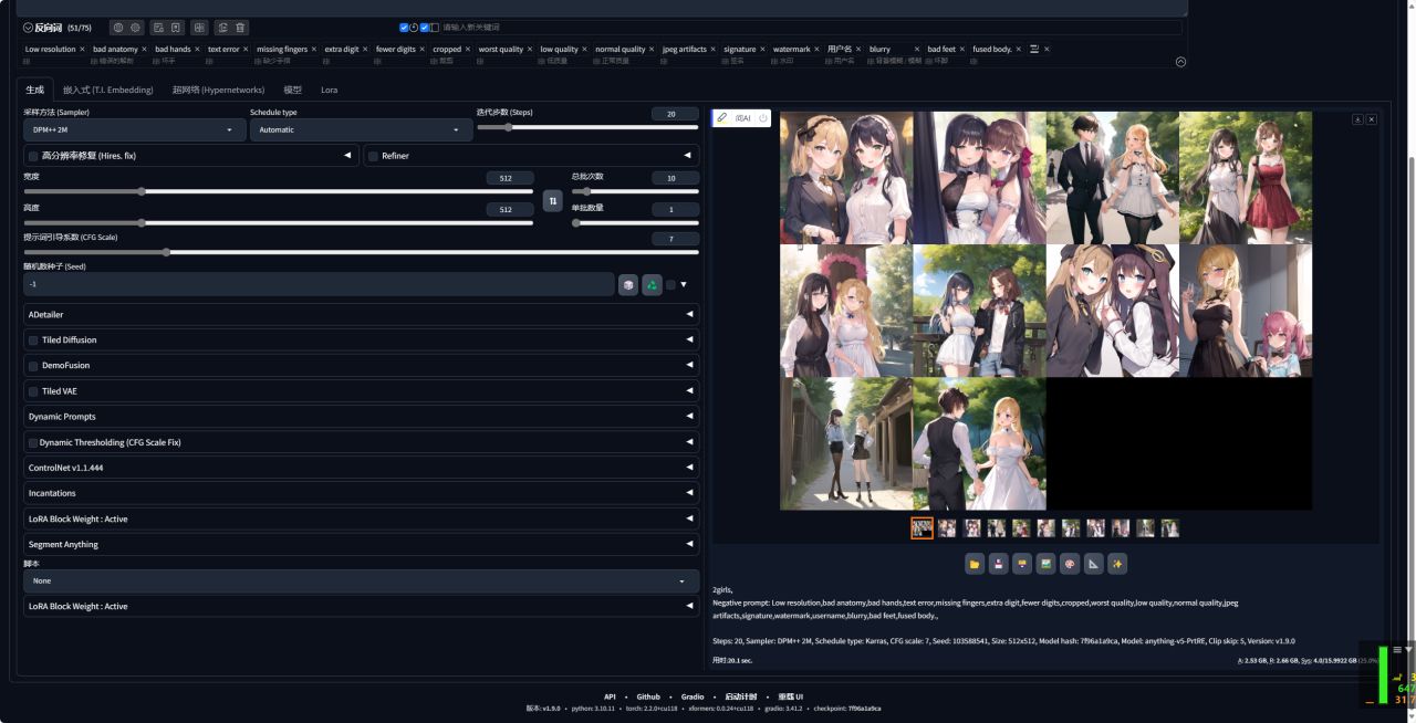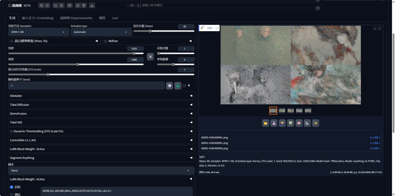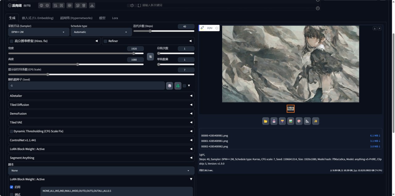Stable Diffusion 的關鍵就是在於設置【提示詞】和【負向提示詞】,AI 會根據提示詞去匹配模型庫中的案例,進而渲染生成特定的圖片。我先嚐試了「1gril」的簡單提示詞,分辨率調整爲1920*1080,迭代步數爲40,可以看到單張耗時在 26.5秒。