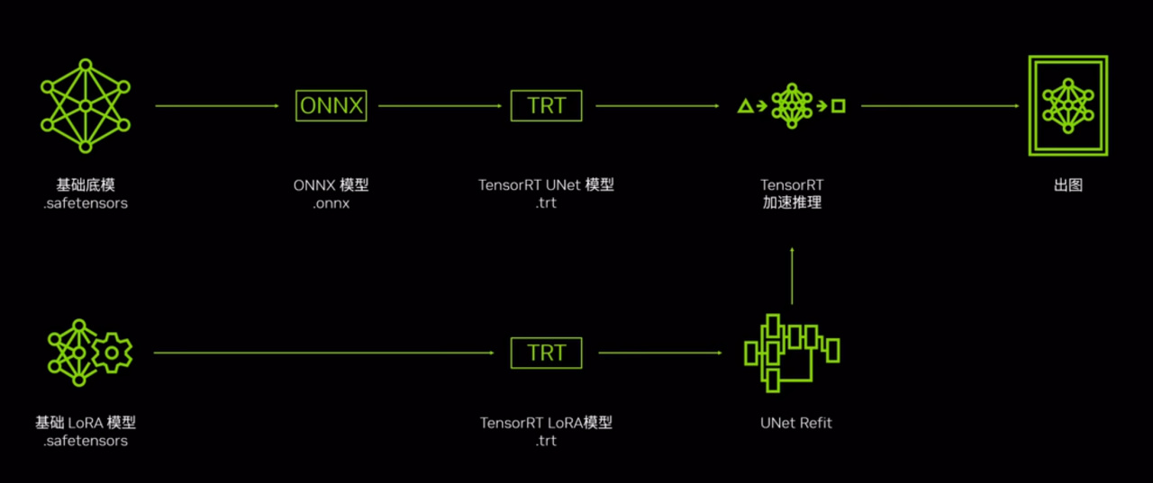 第一步,我們首先需要使用底模構建 TensorRT 模型,構建的過程是 TensorRT 的插件會自動的由底模輸出 ONNX 模型,並構建一個以trt爲後綴的 UNet 優化模型,在得到這個模型之後 我們就可以使用這個trt優化的 UNet 模型進行推理加速了。