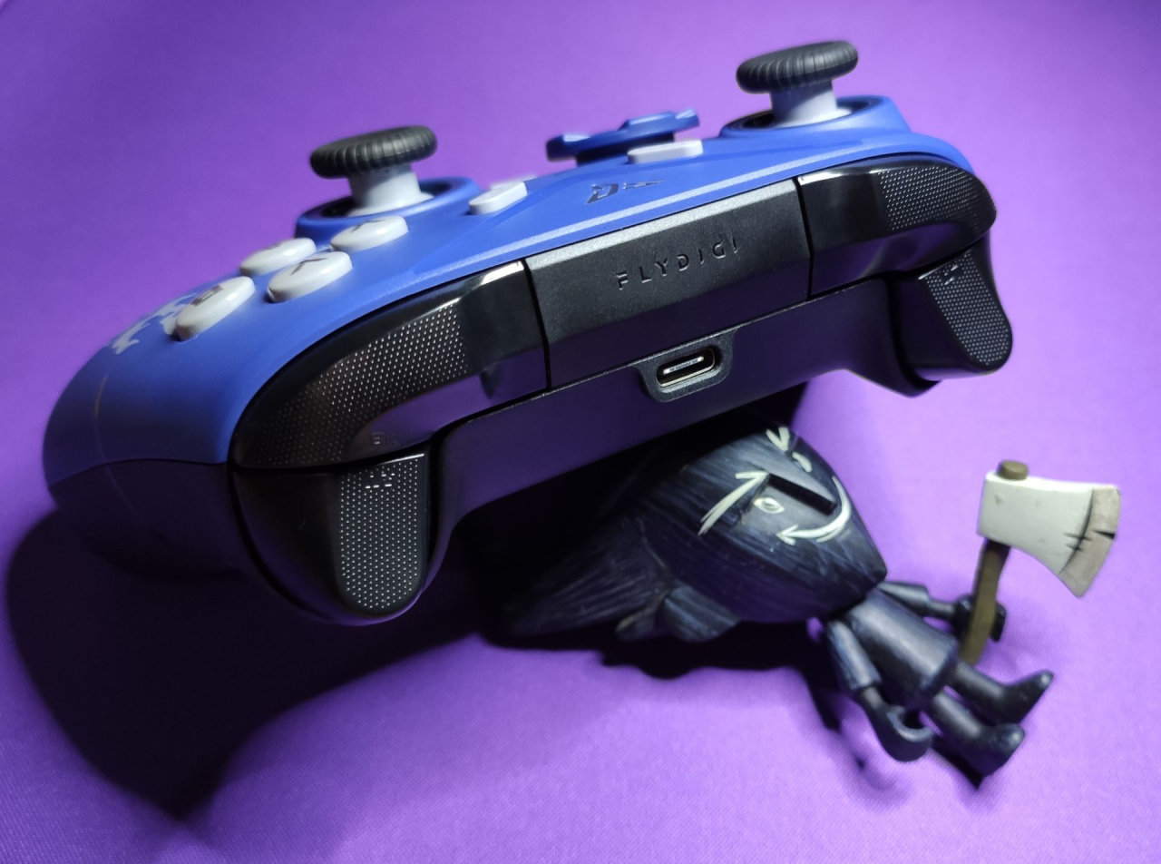 飛智的冰原狼2的上方有一個“飛智”的英文名稱,還有一個C口的數據線接口,扳機是霍爾線性扳機,有着平滑的按鍵紋理,還有着高精度的6軸體感隱射。