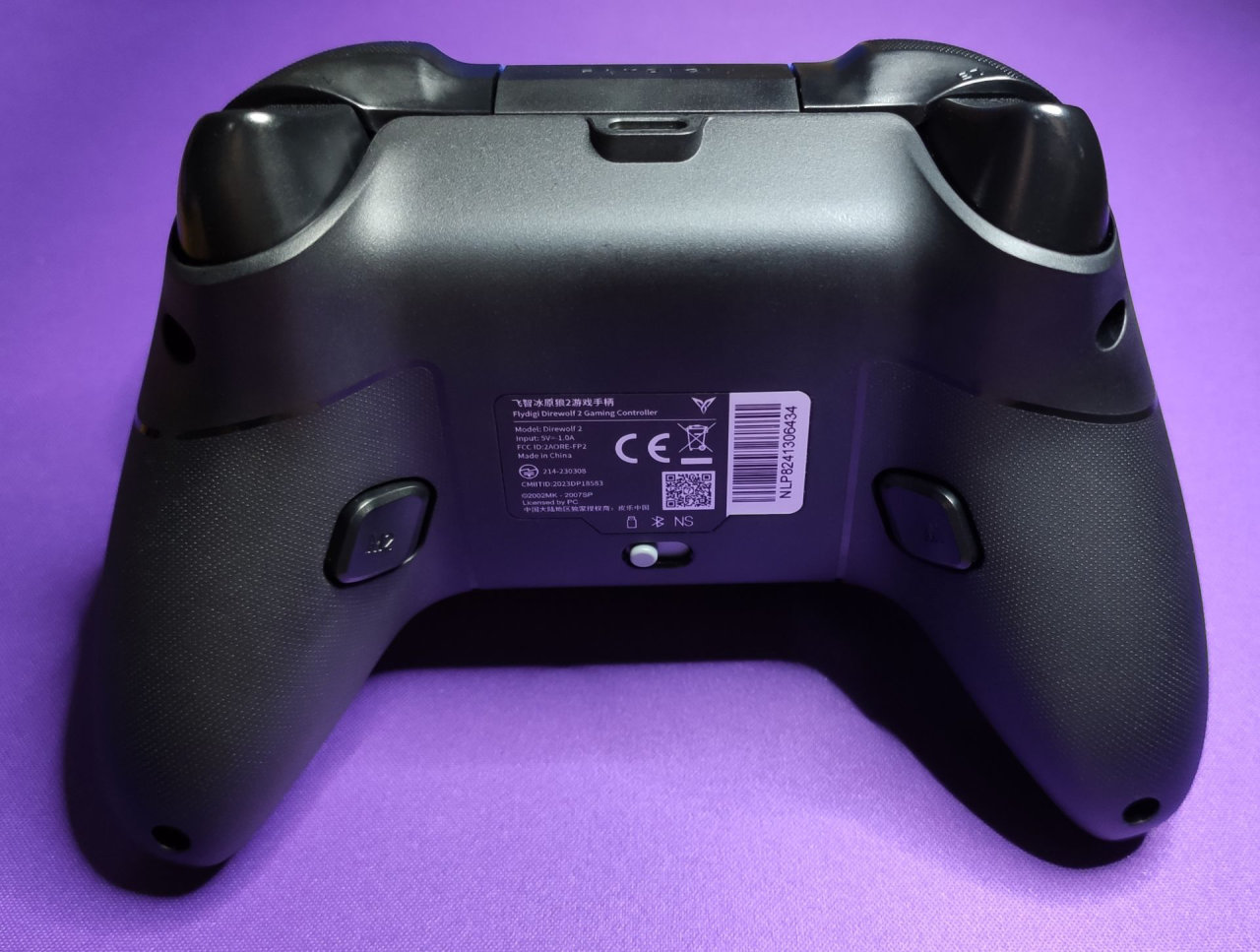 飛智冰原狼2自持3模(有線、2.4G、藍牙),同時還有專門的NS選項,有線回報率是500,無線則是250,內置的是800mah的大容量電池,可以長久使用,還有兩個自定義背鍵,可以設置宏等,握把處也是做有防滑紋路,並且內置了兩個原廠配重的急停電路馬達,更有層次感。