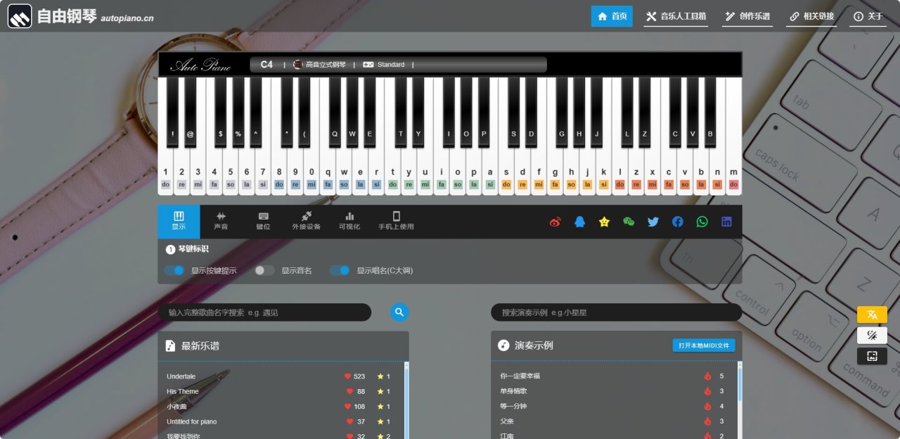 一個可以讓你在線體驗彈鋼琴的網站,哪怕是沒有任何鋼琴基礎的朋友也可以彈奏一首好聽的曲子,彈奏的方法很簡答,它的每個鋼琴按鍵都對應了電腦的鍵盤字母,也可以選擇通過鼠標點擊彈奏。