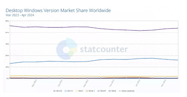 該操作系統在Windows用戶中的採用率降至25%左右,而Windows 10則回升至70%。
