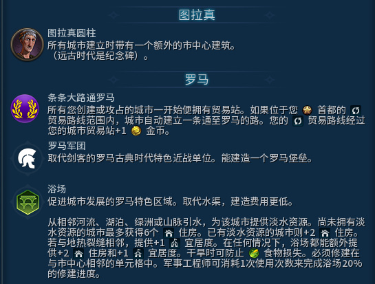 然後簡介下我們選擇的領袖,羅馬的圖拉真。該領袖被認爲是所有領袖中的T0守門員(或者叫T1的巔峯?),並且是公認的技能簡單(不需要專門操作就能觸發)、強力(發力極早,效用很強)。