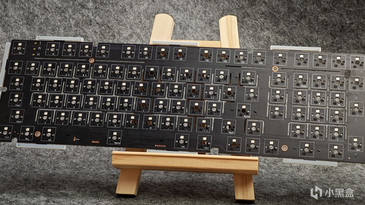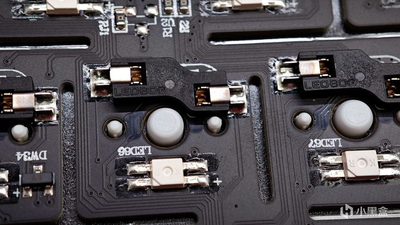 PCB方面同樣爲當前最主流的單鍵開槽配置,燈位爲上燈位。同時可以看到HI98採用的是軸座熱插拔,支持三腳/五腳機械軸體熱插拔,具體軸座品牌爲LEOBOG。