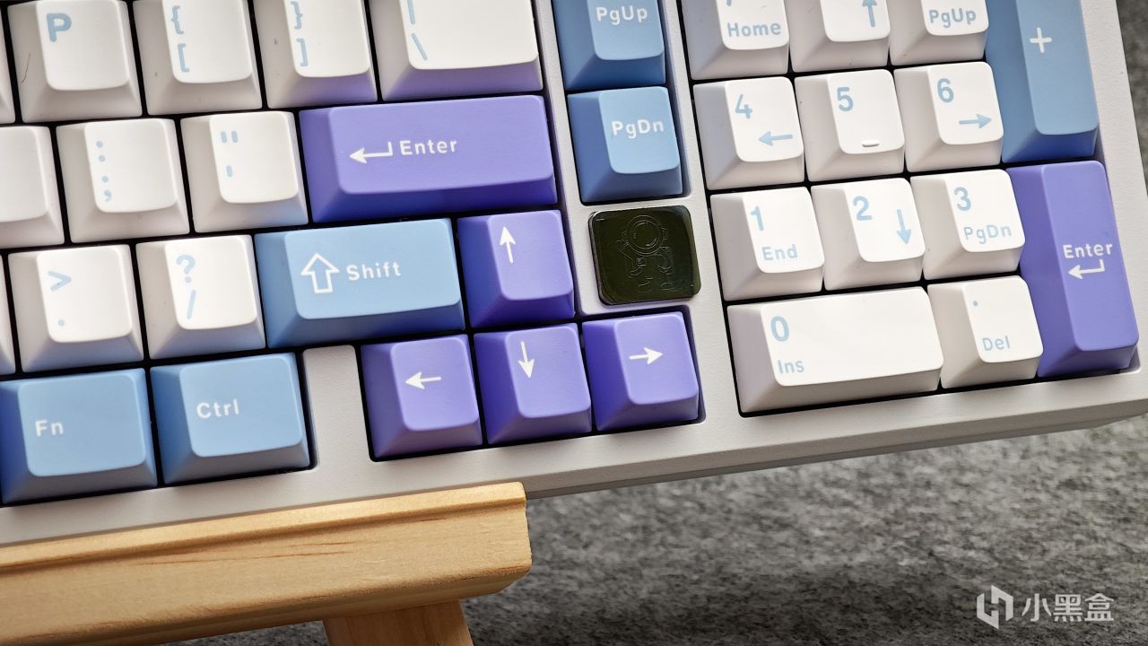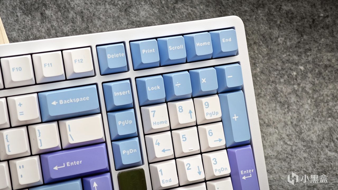 數字區保留了完整的按鍵,就連104配列上獨有的2u0也給完美復刻了。左側因爲有銘牌的緣故,所以方向鍵整體偏左一些,再左側則是僅保留了兩顆1.25u的功能按鍵。