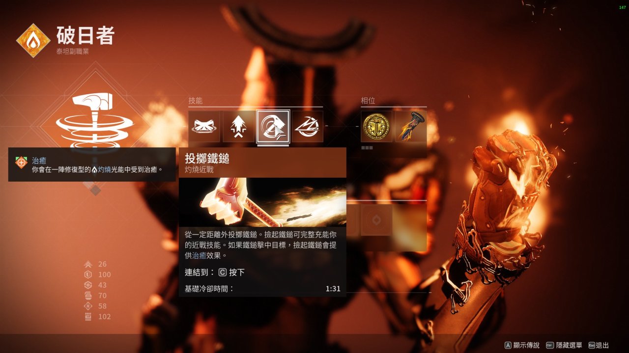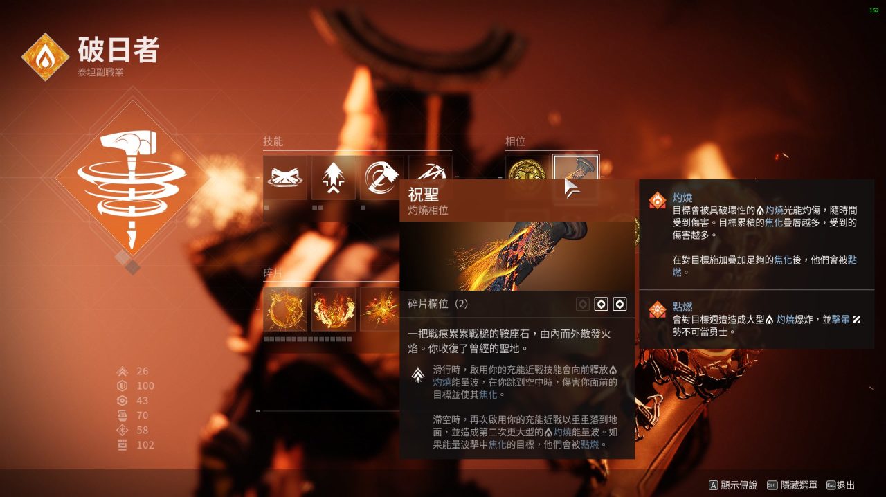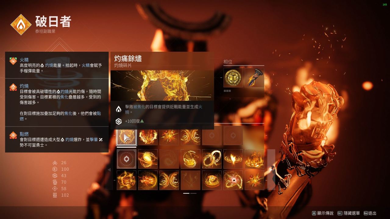 :熾熱餘燼(核心):效果爲擊敗灼燒目標獲得近戰能量,配合星象、金裝以及武器的灼燒效果可以大幅度幫助近戰迴轉 提升爽度