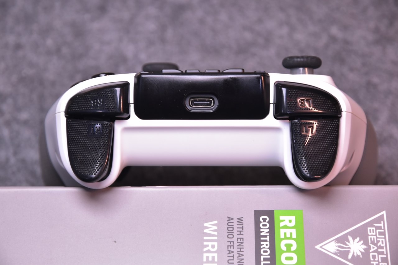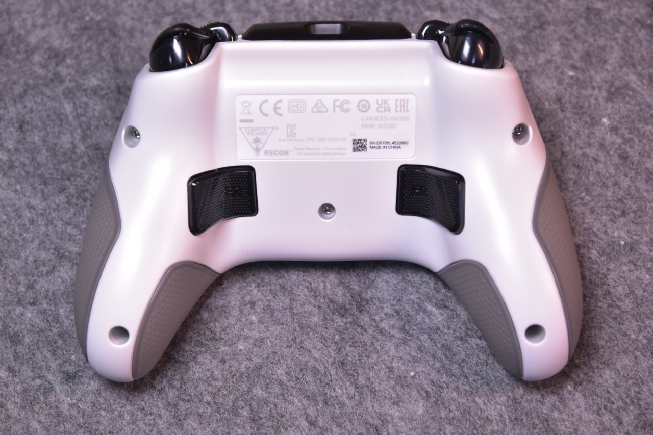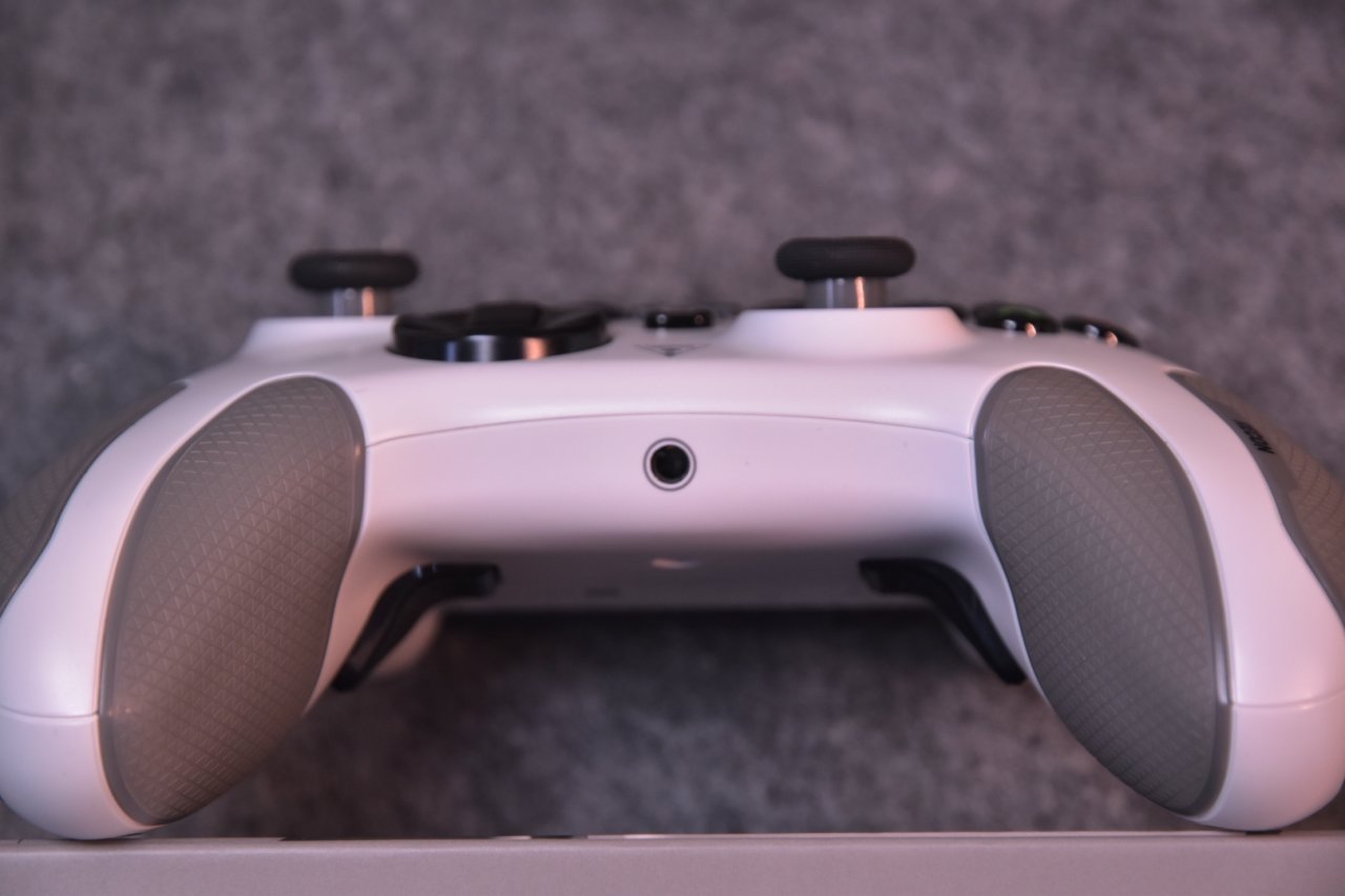 我手上这款手柄为白色配色,摸起来十分光滑,手掌握持的部分,有复合橡胶防滑纹包裹,甚至连手柄的正面,都做了防滑处理,这是许多手柄都不曾做到的,大大提高了手柄的防滑效果,因为是Xbox授权的手柄,所以home键为Xbox样式,在其的上方可以看到许多按键,这些按键用于调节声音、更改射击以及映射按键,手柄底部则为乌龟海岸的logo。