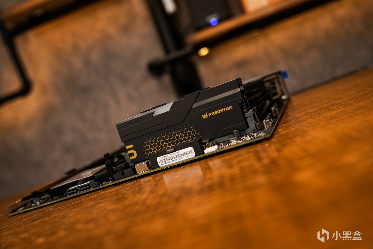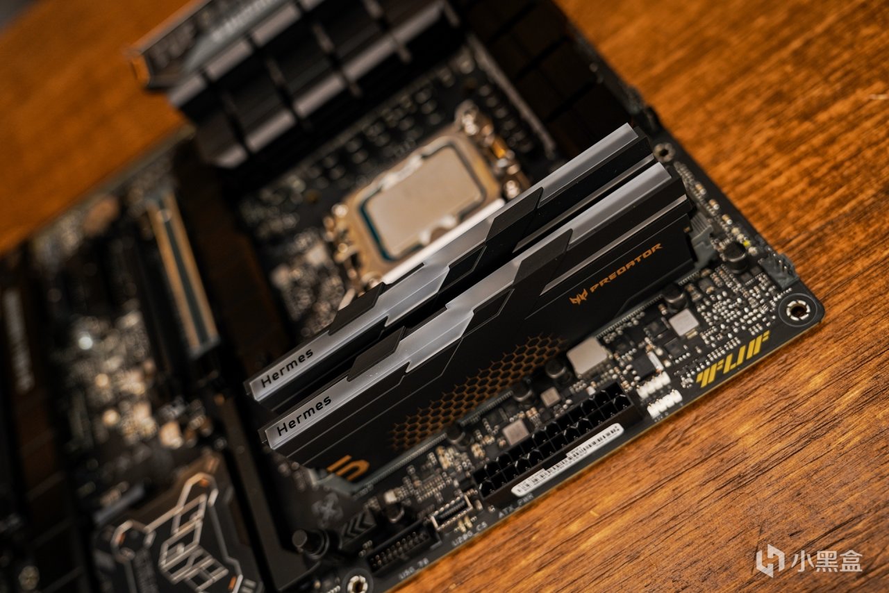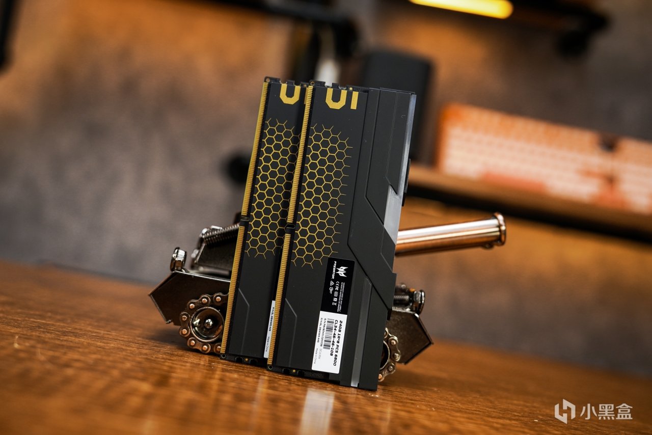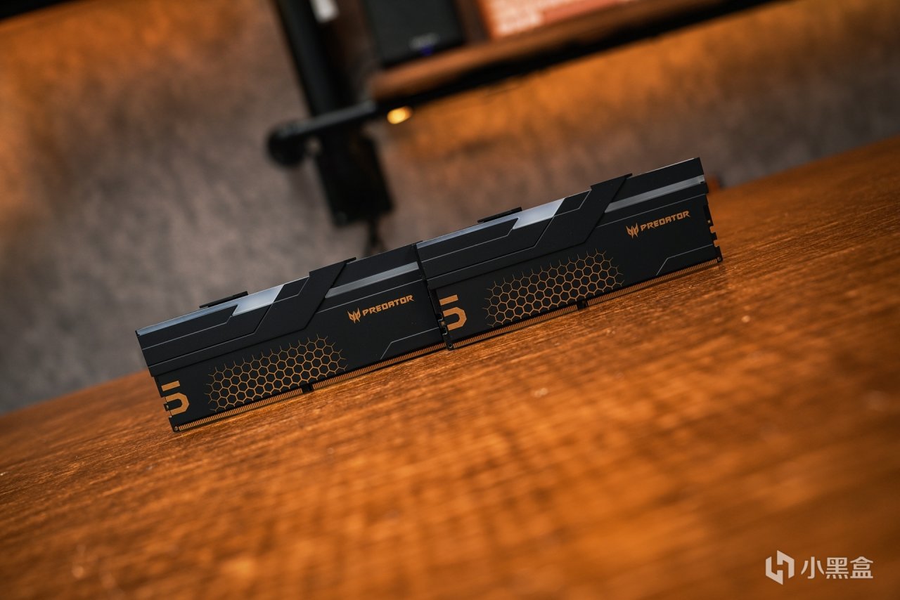 内存:PREDATOR Hermes冰刃 DDR5 6800 24G*2。这款内存定位高端超低时序电竞内存,所以在价格上也是略高于市面同类产品,毕竟是宏基旗下的旗舰级系列产品。极具工业风设计搭配上和这次主题非常贴切的黑金配色散热马甲。